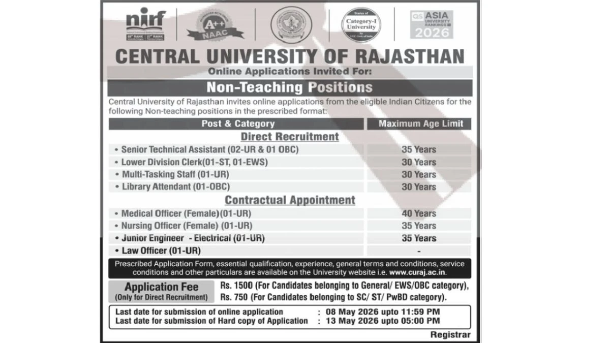 Central University of Rajasthan (CURAJ) has released an official notification for the recruitment of Non-Teaching Positions in 2026. This recruitment drive invites online applications from eligible Indian citizens for both Direct Recruitment and Contractual posts across multiple departments. This is a great opportunity for candidates seeking government jobs in the education sector.